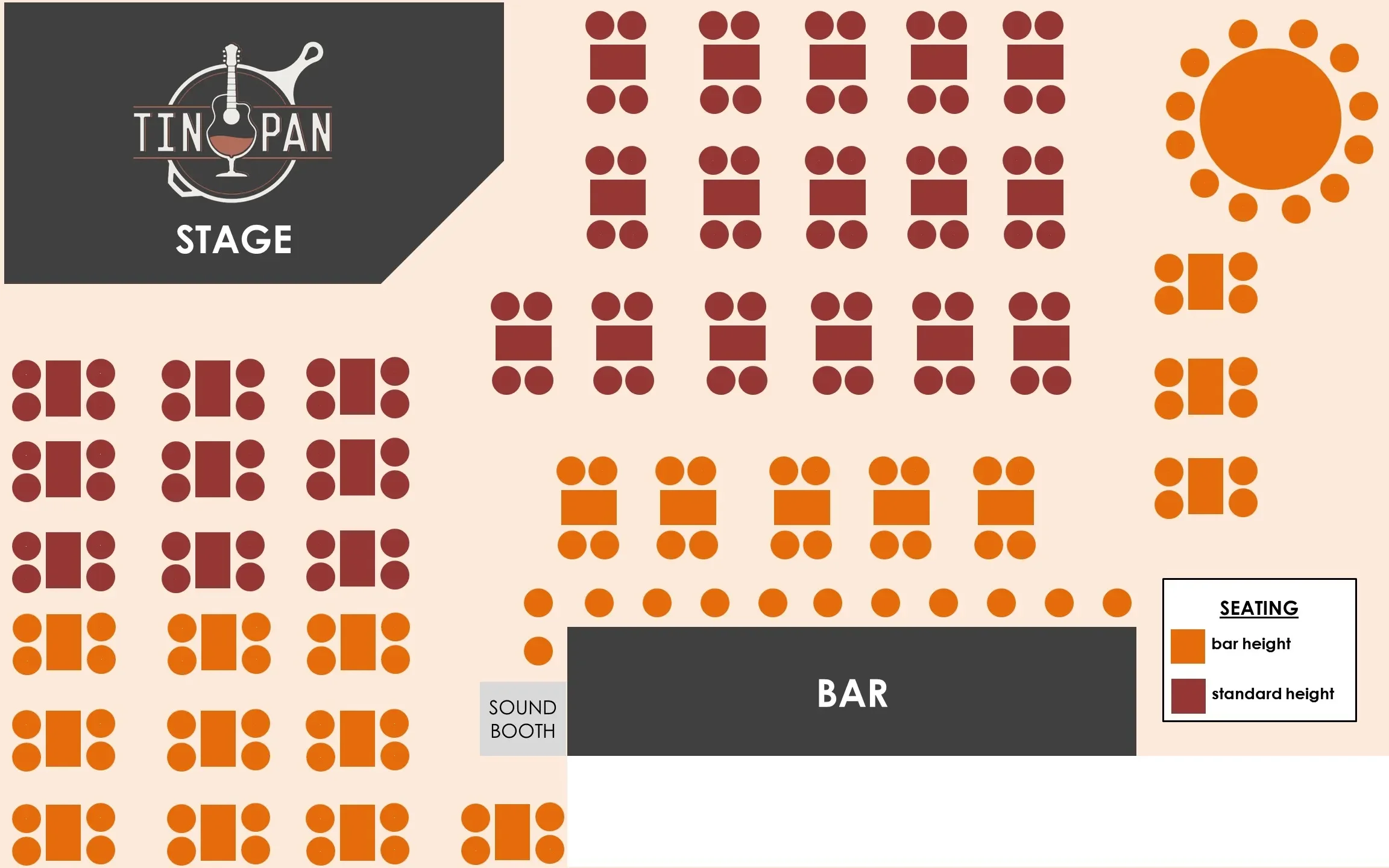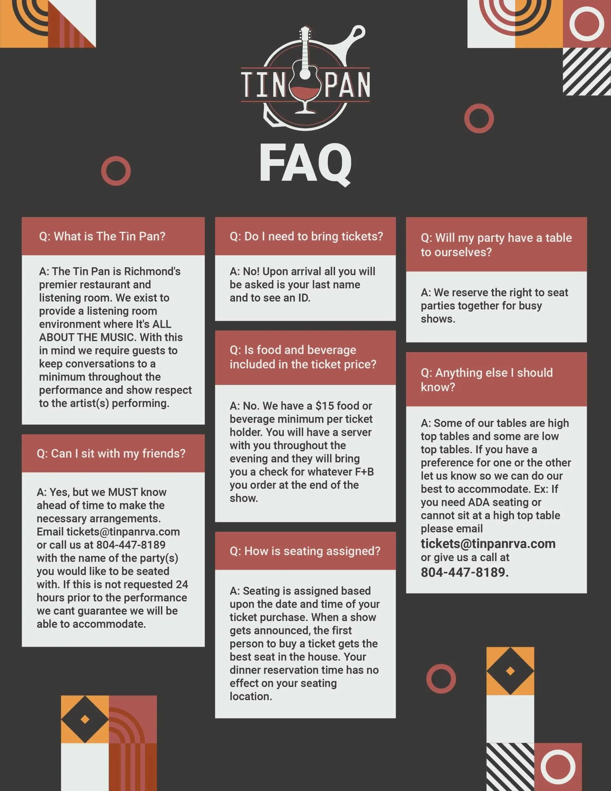 If you buy more than one ticket in a single transaction, we automatically seat your entire party together. If multiple groups are buying tickets separately and want to be seated together, please first purchase your tickets, then email us at tickets@tinpanrva.com with the order numbers of all parties who wish to sit together.